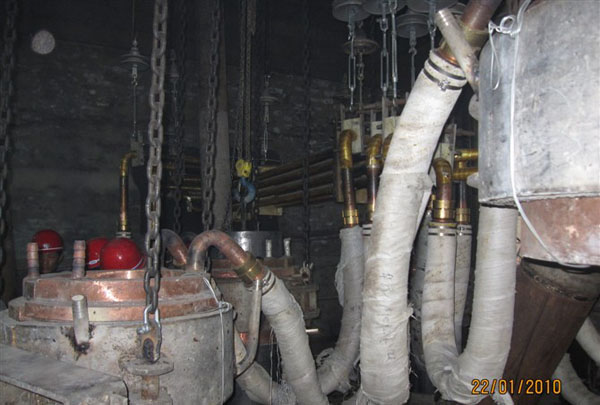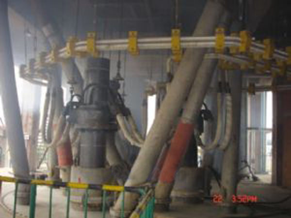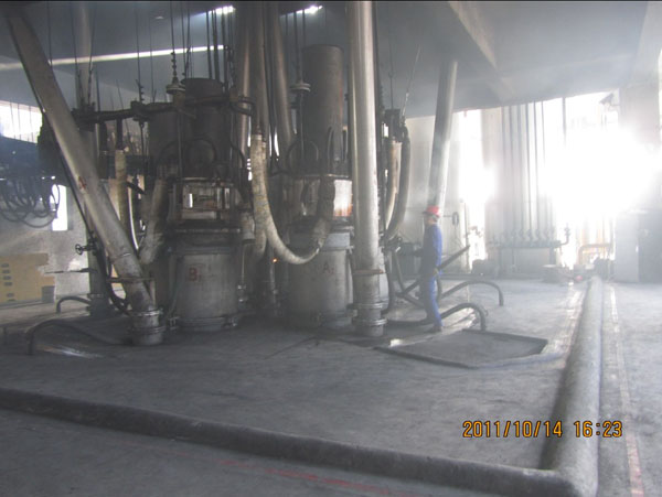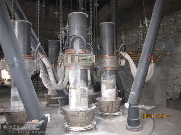 黄磷电炉包括炉体(1)、变压器(2)、石墨电极(3)、金属导体(4)和出线端(5),变压器(2)通过出线端(5)与金属导体(4)两端相连,并且金属导体(4)与石墨电极(3)相连,石墨电极(3)位于炉体(1)中,所述石墨电极(3)为六根,垂直均匀地分布在以电炉的中心点为圆心的一圆周上,形成六相电极。