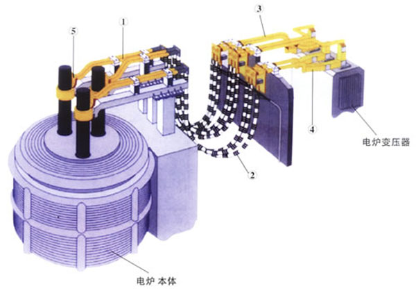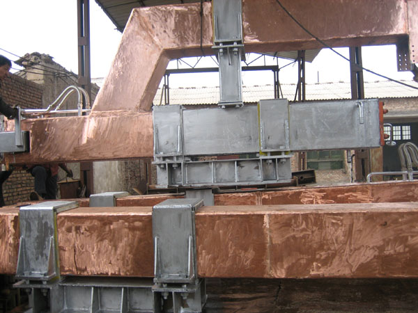本系列电弧炉水冷复合导电横臂为矩形梁结构,有铜、钢复合板焊接而成,其外表面铜板导电,将电极横臂的导电和支撑电极两种功能合为为一。由于取消了传统电极横臂上的导电铜管及诸多绝缘环节,简化了结构,增加了导流面积,可大大减少阻抗值和维修工作量,可广泛应用于5t-100t电弧炉和大吨位钢包精炼炉。