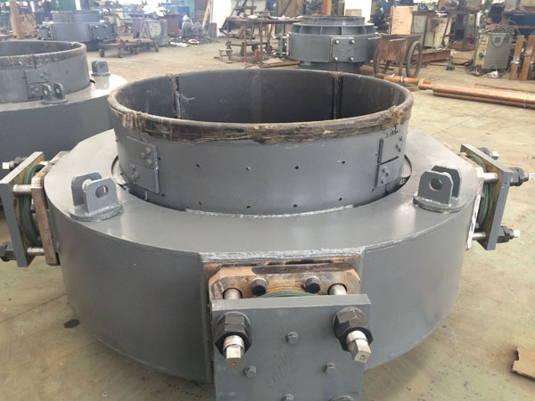(4)单抱闸压放装置。在中型矿热炉上只有上抱闸,固定在三个升降油缸上。压放程序为:在铜瓦夹紧的情况下,松开上抱闸,用压放(升降)油缸将上抱闸升到150mm左右,紧上抱闸,然后松开铜瓦顶头,用油缸压下上抱闸,再顶紧铜瓦,开始冶炼。