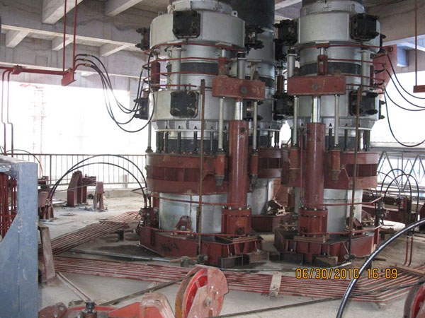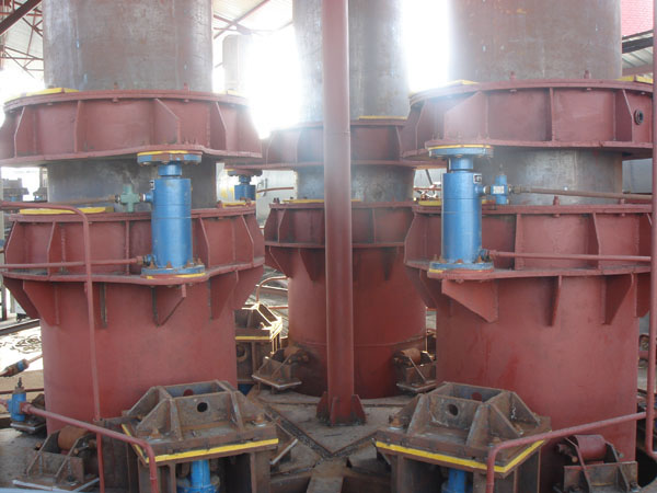 (3)无压放油缸电极压放装置。它由上下分开的两个抱闸组成,中间没有压放油缸连接。下抱闸在电极把持筒的上方,用三个升降油缸支撑,用它来控制电极的压放长度。上抱闸与电极糊平台牢固连接。这种装置的特点是:在正常工作情况下,上抱闸处于常开状态。压放电极时,上抱闸抱紧,下抱闸松开,用电极升降油缸提升把持器,从而使电极工作长度得以补充。